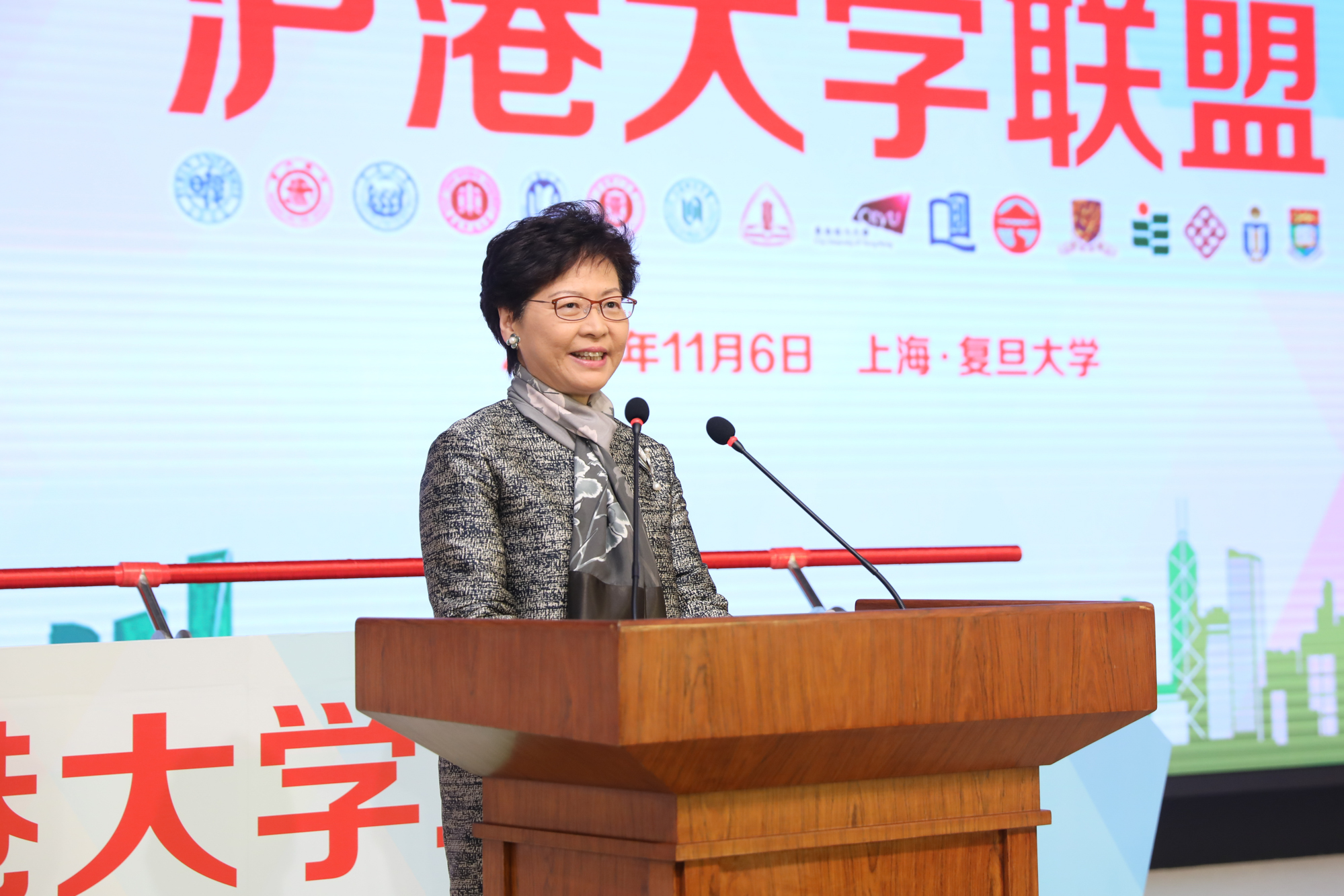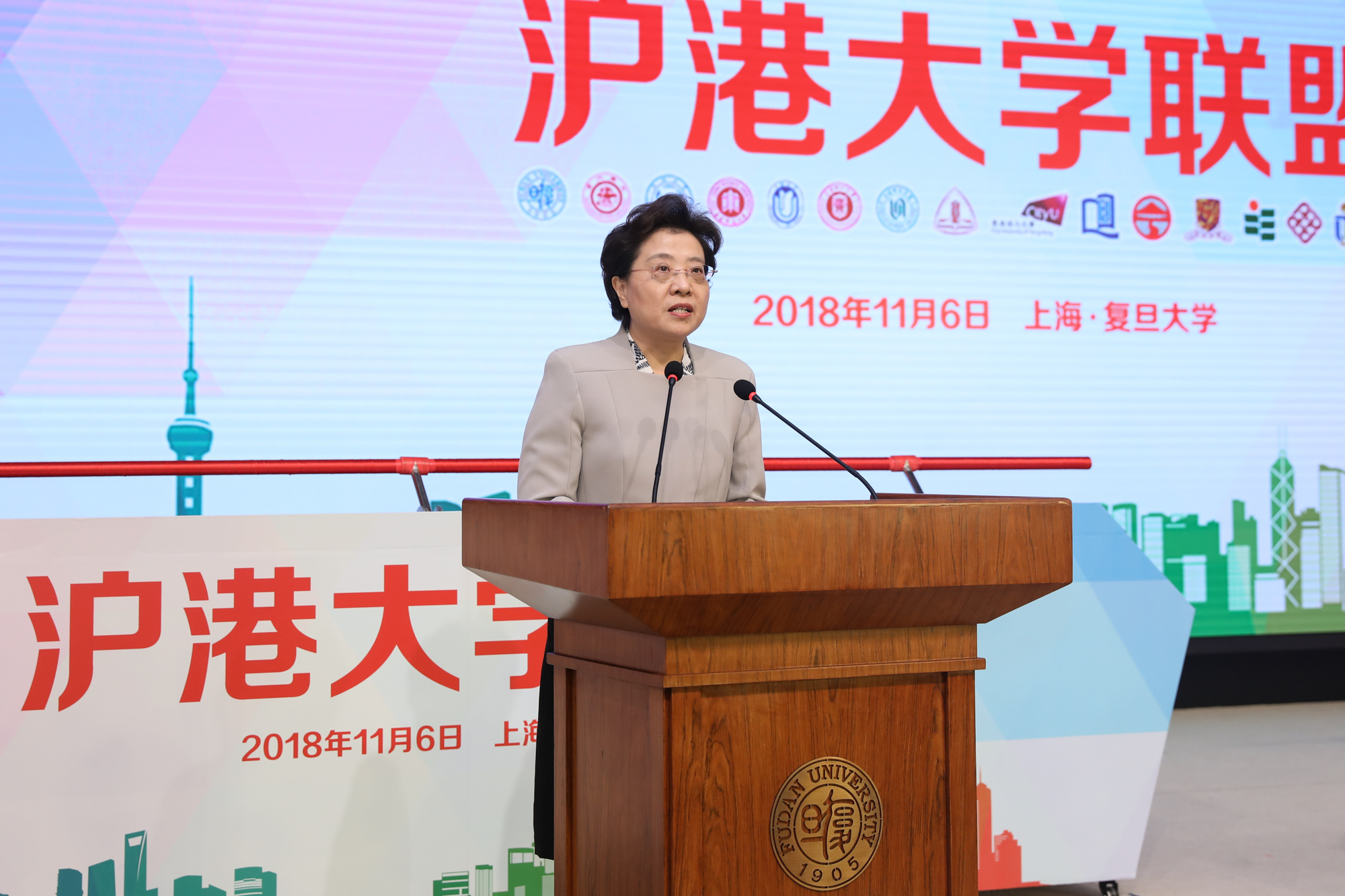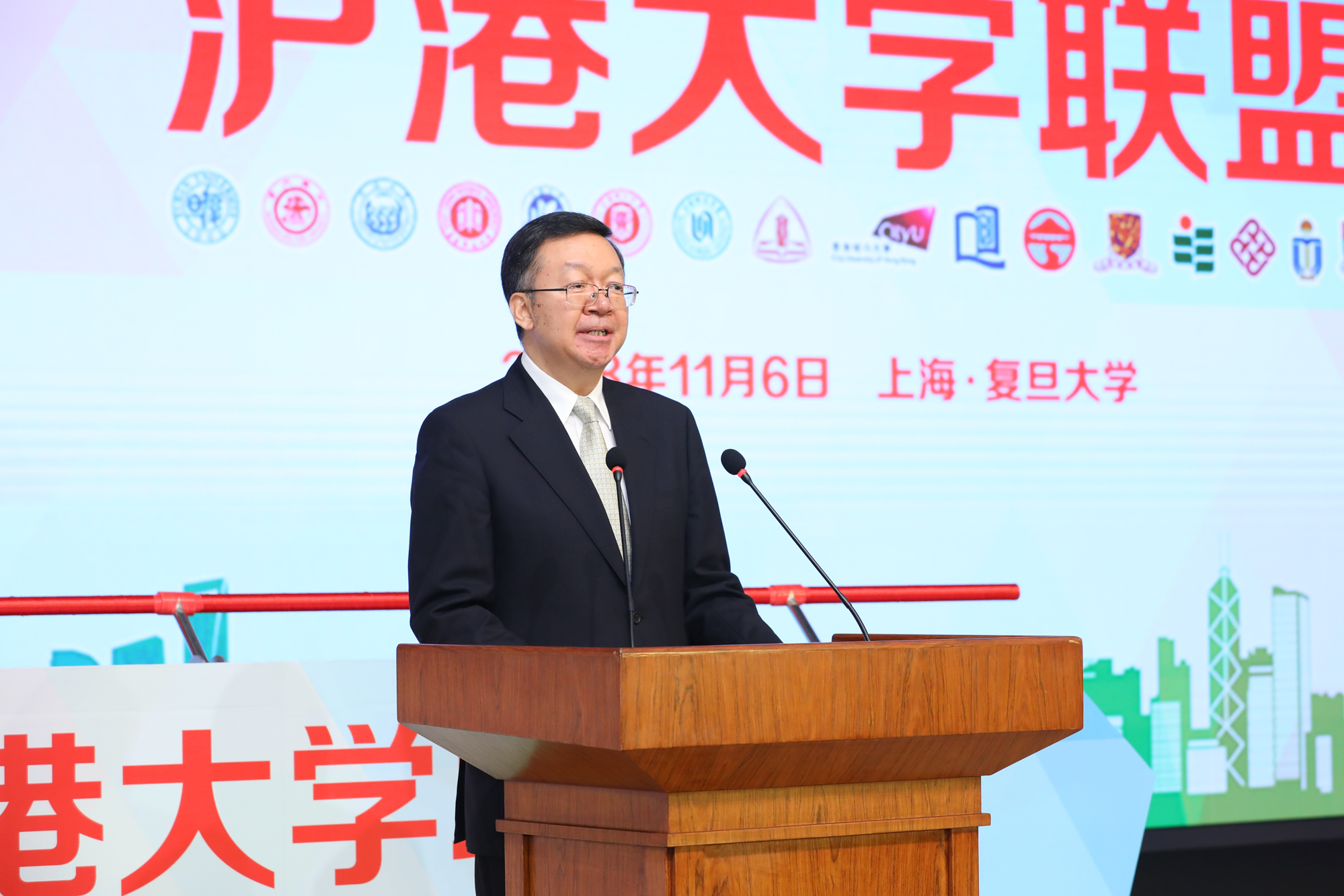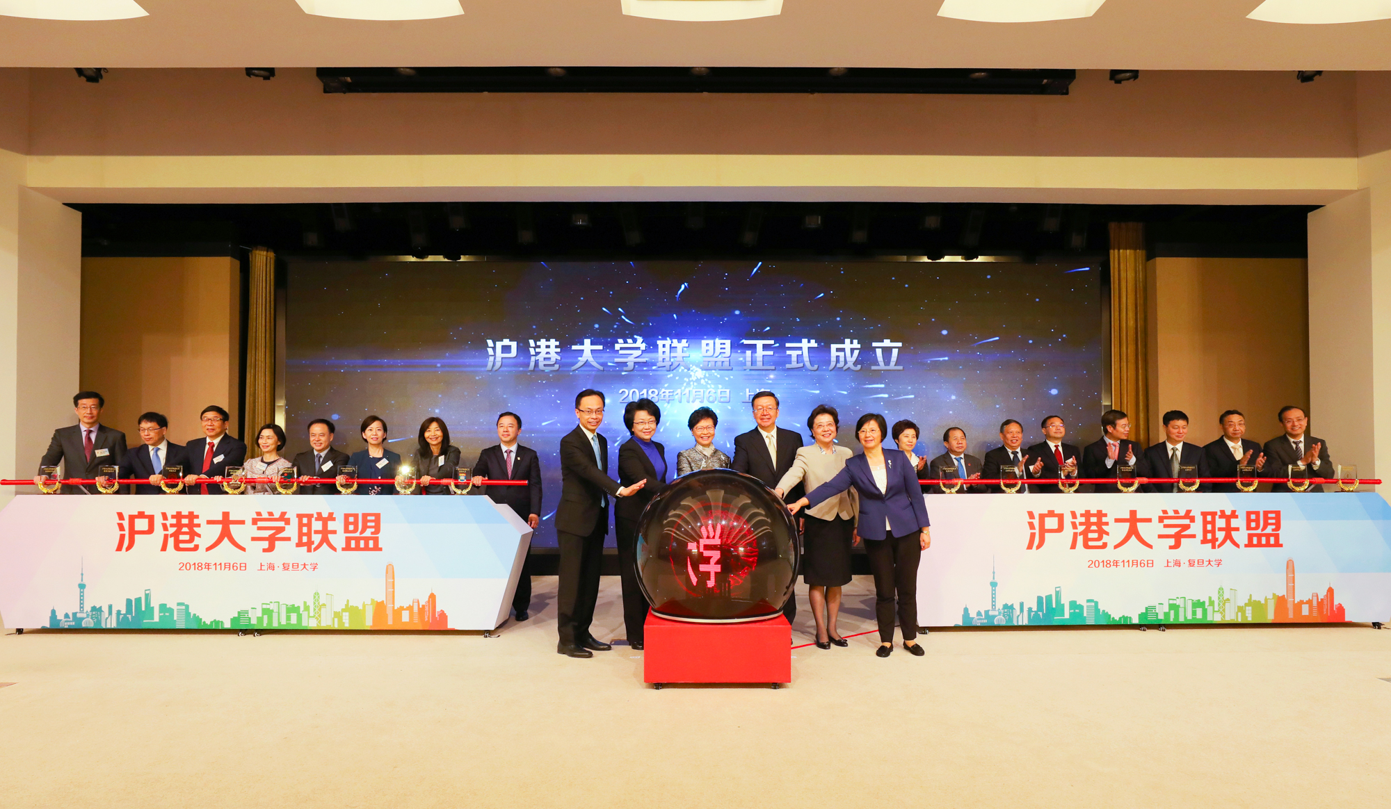 11月6日,“沪港大学联盟” 成立仪式在复旦大学光华楼举行,周傲英副校长代表我校出席了该仪式及沪港教育交流展、第一届理事会第一次会议,校港澳台办公室、学工部和其他21位师生代表参加了本次活动。香港特区行政长官林郑月娥、教育部副部长田学军、上海市副市长翁铁慧、中央政府驻港联络办副主任仇鸿、教育部港澳台办公室、沪港两地教育主管部门的领导以及16所沪港高校代表出席了联盟成立仪式。