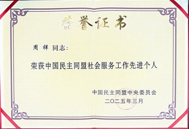 盟员周祥荣获 “中国民主同盟社会服务工作先进个人”。