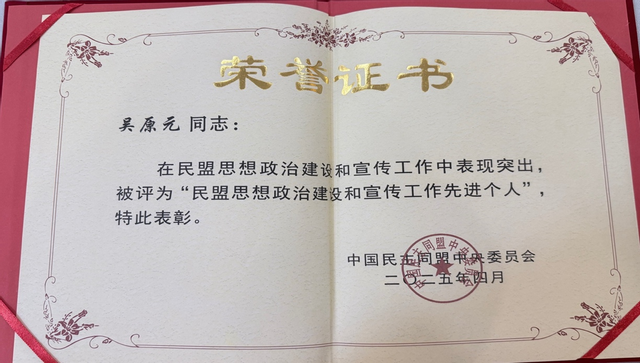 盟员吴原元荣获“民盟思想政治建设和宣传工作先进个人”。