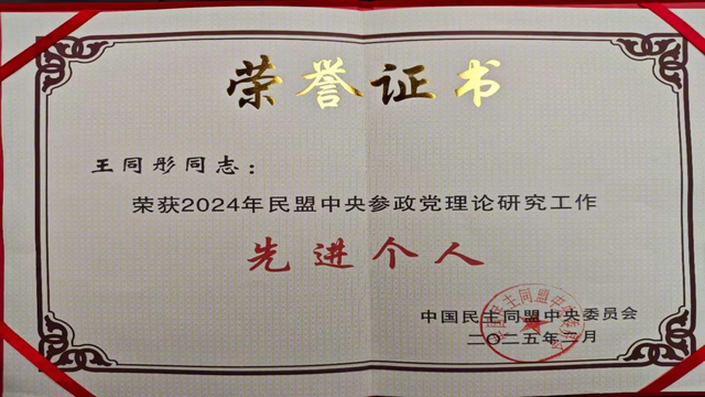盟员王同彤荣获“2024年民盟中央参政党理论研究工作先进个人”。