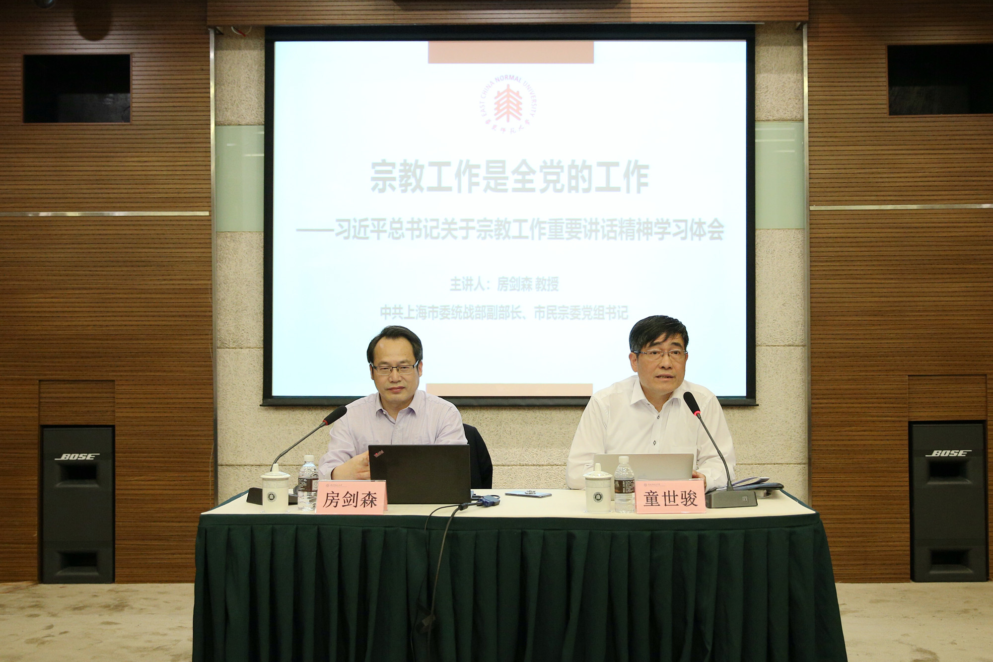 5月23日,校党委中心组学习扩大会在中山北路校区举行,专题学习习近平总书记关于宗教工作的重要论述。会议邀请中共上海市委统战部副部长、上海市民族和宗教事务局党组书记房剑森教授作题为《宗教工作是全党的工作——习近平总书记关于宗教工作重要讲话精神学习体会》的辅导报告。校党委书记童世骏,校党委常务副书记王宏舟,校党委副书记杨昌利,校党委副书记、纪委书记曹友谊,副校长李志斌、周傲英,校党委常委、宣传部部长顾红亮,相关职能部门负责人及各院系级党组织书记出席中心组学习扩大会。会议由童世骏主持。
