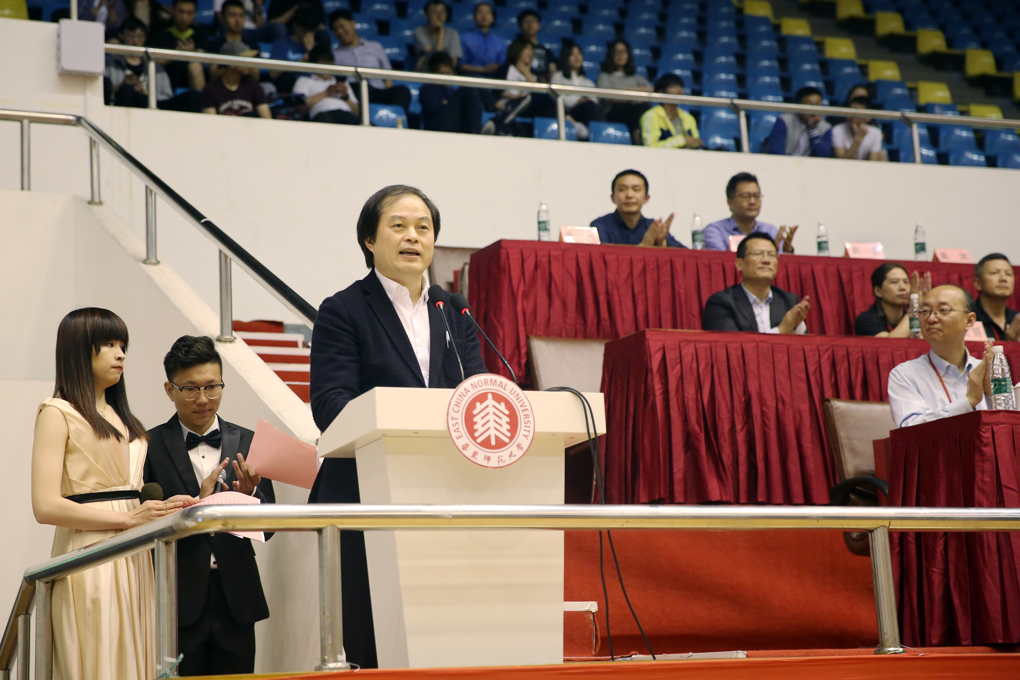5月4日下午,2018年“海峡杯”两岸高校篮球邀请赛开幕式在中山北路校区体育馆举行。上海市海峡两岸交流促进会会长李雷鸣,上海市体育局副局长罗文桦,台湾艺术大学校长陈志诚,我校副校长汪荣明、体育与健康学院院长季浏、港澳台办公室主任章平出席开幕式。各参赛队领队及各部门领导与会。