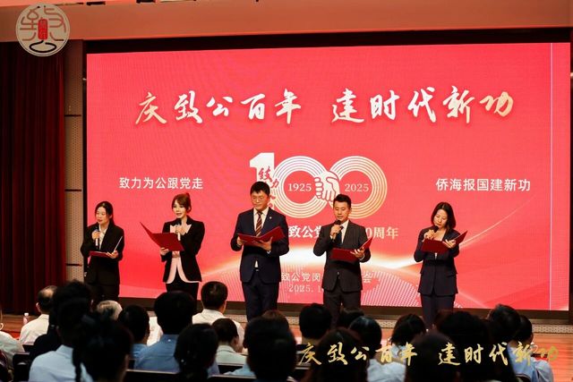 2025年10月10日,中国致公党迎来了第100个生日。这一天,致公党闵行区委在闵行致公书院(晶城中学梦想剧场)举办庆祝中国致公党成立100周年活动,深情回顾中国致公党自成立以来,与中国共产党风雨同舟、肝胆相照的百年光辉历史,总结致公党闵行区委服务经济社会发展取得的丰硕成果,激励广大致公党党员致力为公跟党走、侨海报国建新功。闵行区政协党组书记、主席祝学军,致公党上海市委专职副主委刘新宇,闵行区委常委、统战部部长吴继华,上海交通大学党委常委、统战部部长汪后继,华东师范大学党委常委、统战部部长、学校办主任张惠虹,上海戏剧学院党委常委、统战部部长胡佐,闵行区各民主党派主委等出席活动。